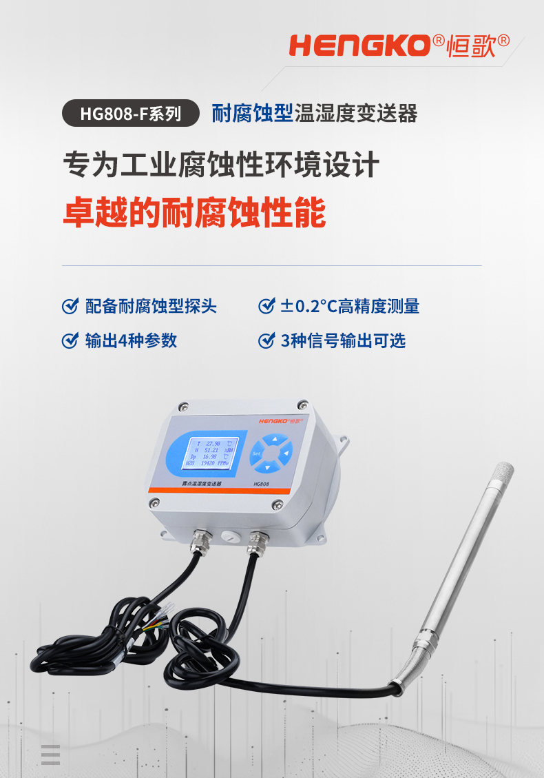 HG808-F系列耐腐蝕型溫濕度變送器/傳感器專為工業腐蝕性環境設計,采用高品質傳感器和先進制造工藝,具備卓越的耐腐蝕性能。外殼選用優質不銹鋼材質,防護等級高達IP65,能有效防塵、防水。傳感器探頭由耐腐蝕性材料制成,并經過耐腐蝕性表面處理,抗腐蝕能力強,確保在惡劣條件下穩定工作。